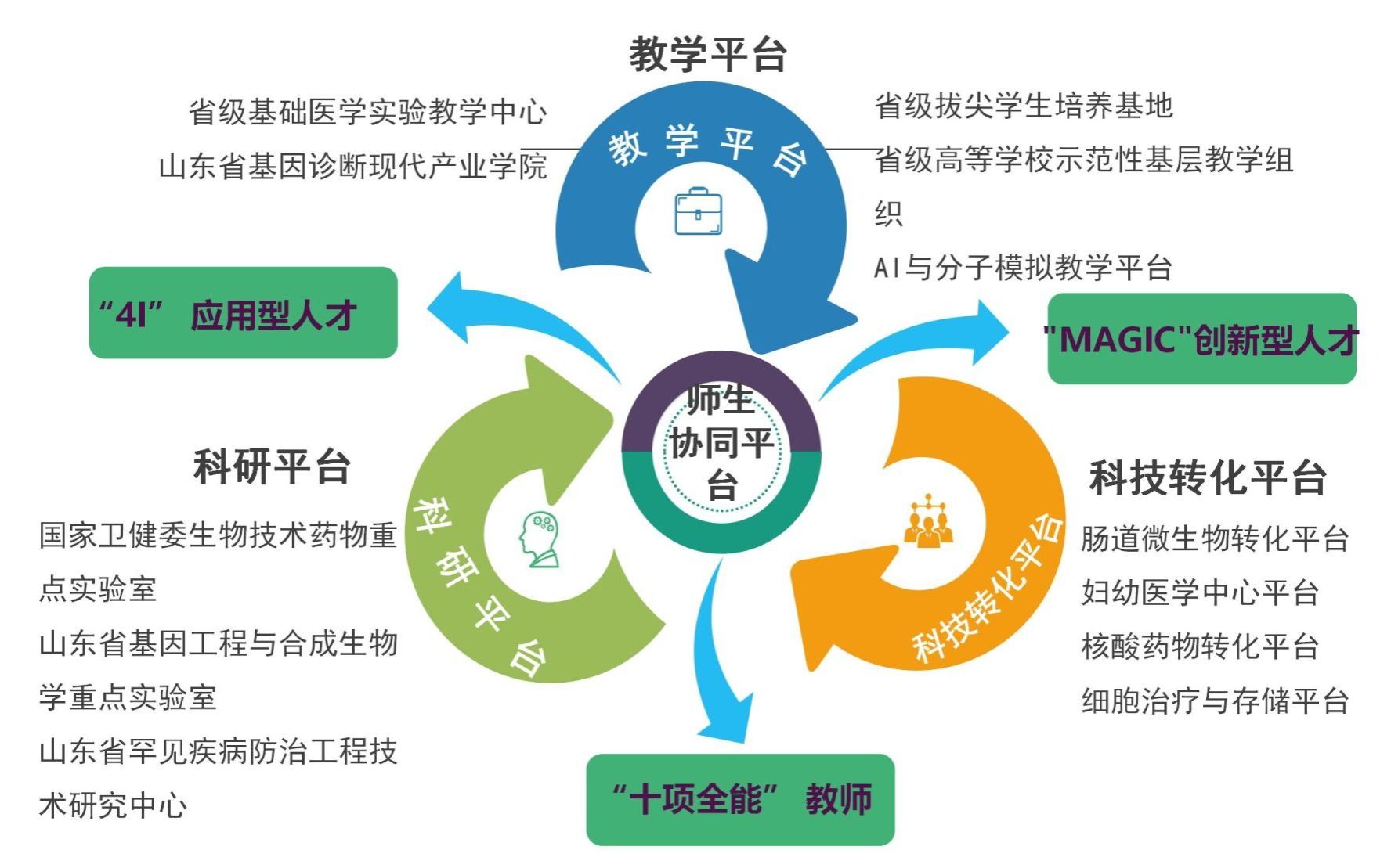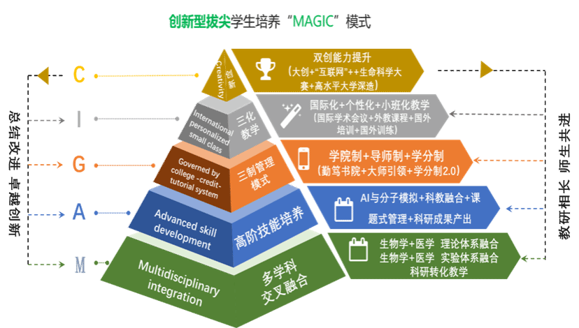 学科整合,构建高性能育人模式。"创新+应用"双轨并行的培养体系,升级传统生物技术专业,统筹并整合学科特色,建设生物医学科学新专业,组建"泰山班",依托基因诊断现代产业学院的基础研究与成果转化职能,打造"课堂-实验室-社会应用"链式培养路径,实施"MAGIC"方式,培育"生物+医学"创新-应用“双职能”人才。形成“应用+创新型”学生和“十项全能”教师并举的模式。