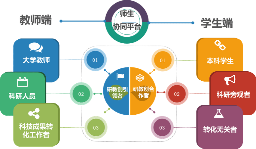 师生配合,构建高质量育人途径。以学业导师制为基础,打破教师和学生角色界限,构建“大学教师”、“科研人员”、“科技成果转化工作者”三个角色统一为平台“引导者”,将学生转变为平台的积极“合作者”的师生合作模式,构建学生进平台、进课题、进团队机制,实现师生在研和转中“践”教学、教和学中“启”研转。 ![]()