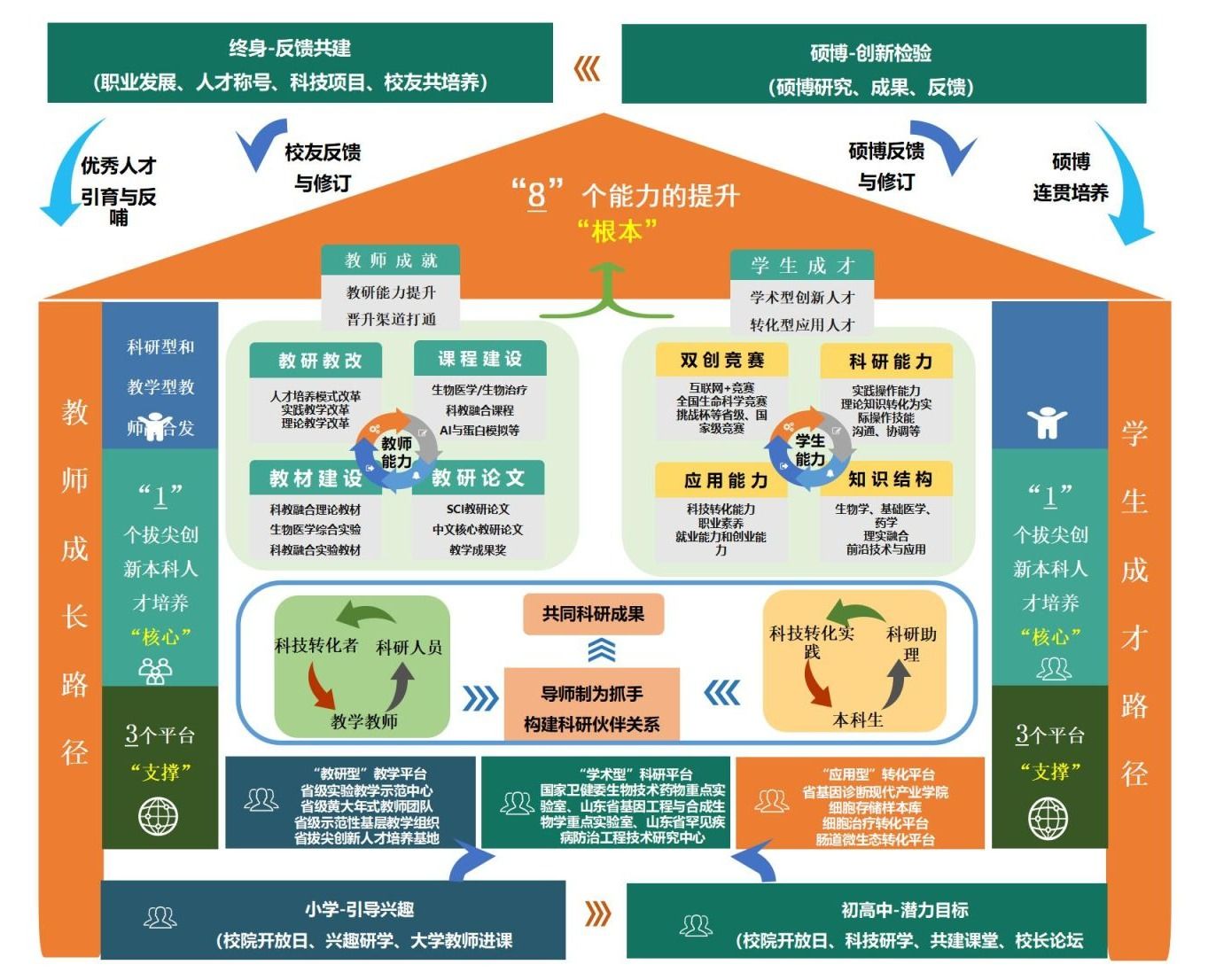 成果团队以“动态发展观理论”为基础,以“拔尖创新人才”为目的,发挥校(院)科教资源优势,通过将科教融汇注入拔尖创新人才培养的全过程,构建师生“共进步”兼容路径(师生共进);“产-教-研”资源共享转化机制(产教研共享);拔尖创新人才的选才、鉴才动态机制(选鉴共举)。通过本成果通过三合(平台融合、师生配合和学科整合)、三协(研教协作、研产协助和产教协同)和三同(多阶段一同、内外协同和多层次共同)育人模式,完成8个提升(教师教研教改能力、课程建设能力、教材建设能力、教研论文能力,学生双创能力、科研能力、知识结构、应用能力)。